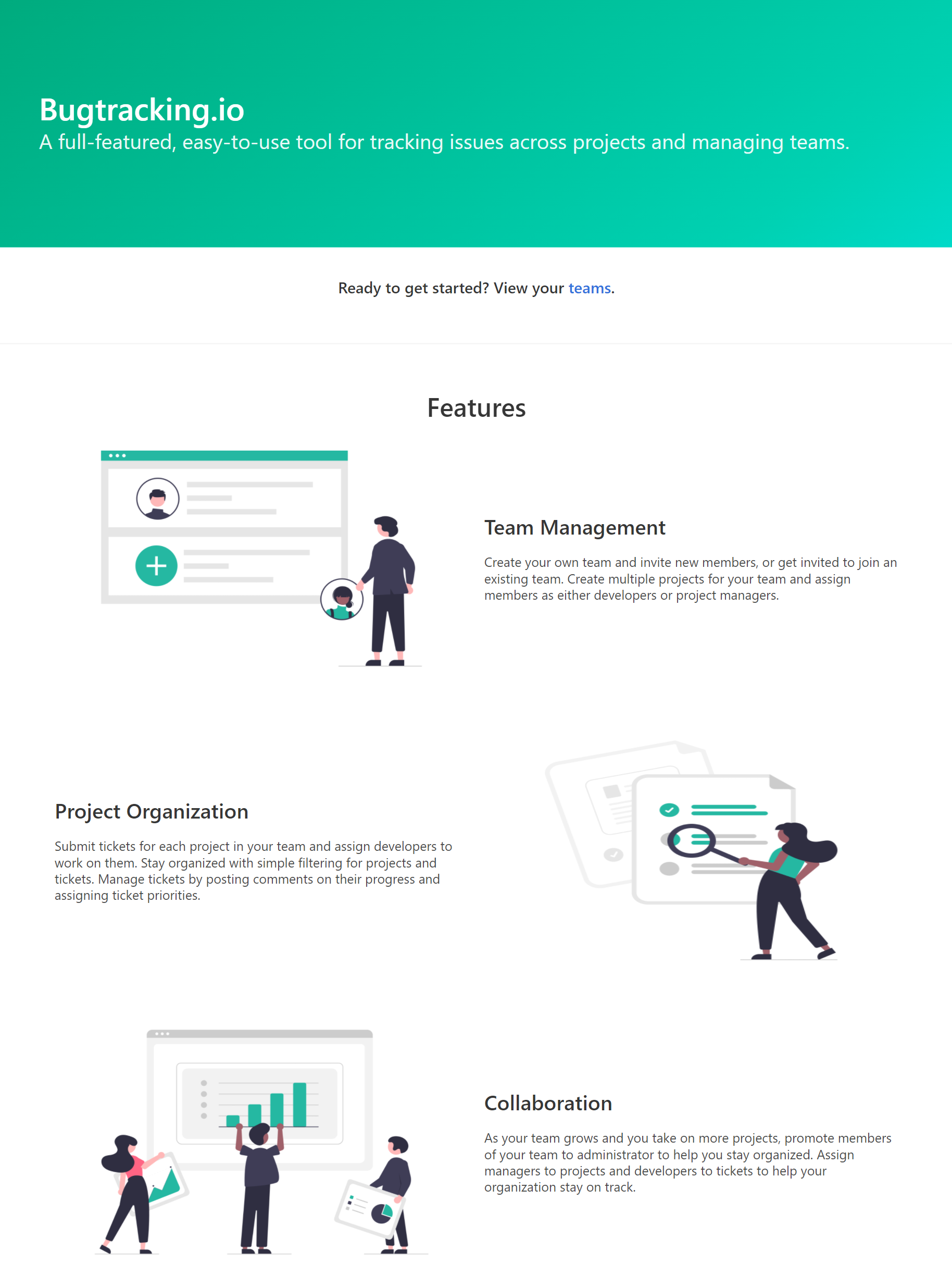 Bugtracking.io is a bug tracking platform featuring user-managed teams and support for multiple projects. It is a full stack web application using React on the front end and a containerized API built with Django Rest Framework on the back end, alongside Google Firebase for user authentication.